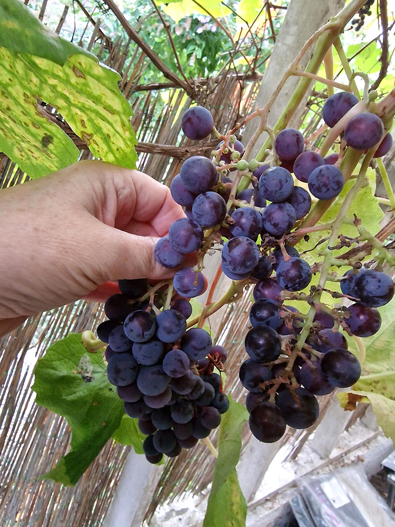 När vindruvan fått fäste på sin växtplats brukar skörden snart bli överväldigande. De  uppskattas av fåglar och då speciellt mina höns som äter allt de når, men självklart ska vi ta dem tillvara också för att själva äta eller dricka.