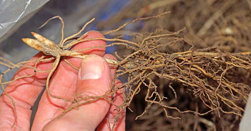 - Ansa bort rötter som ser taniga eller torra ut med en vass sekatör. Korta också in de längsta rötterna.