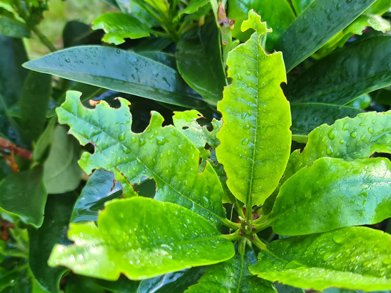 Öronvivelns typiska gnaghål längs bladkanten, så kallade "biljettklipp". Här på rhododendron.