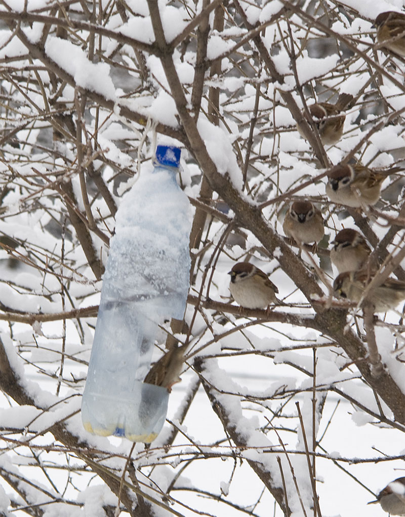 - Göra en egen matare av till exempel en pet-flaska och häng upp i träd eller buskage.