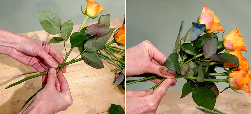 5. Börja med de mest utslagna blommorna. Lägg de första stjälkarna i kors med den översta lutande åt vänster. Håll fast korset mellan tummen och pekfingret i vänster hand.