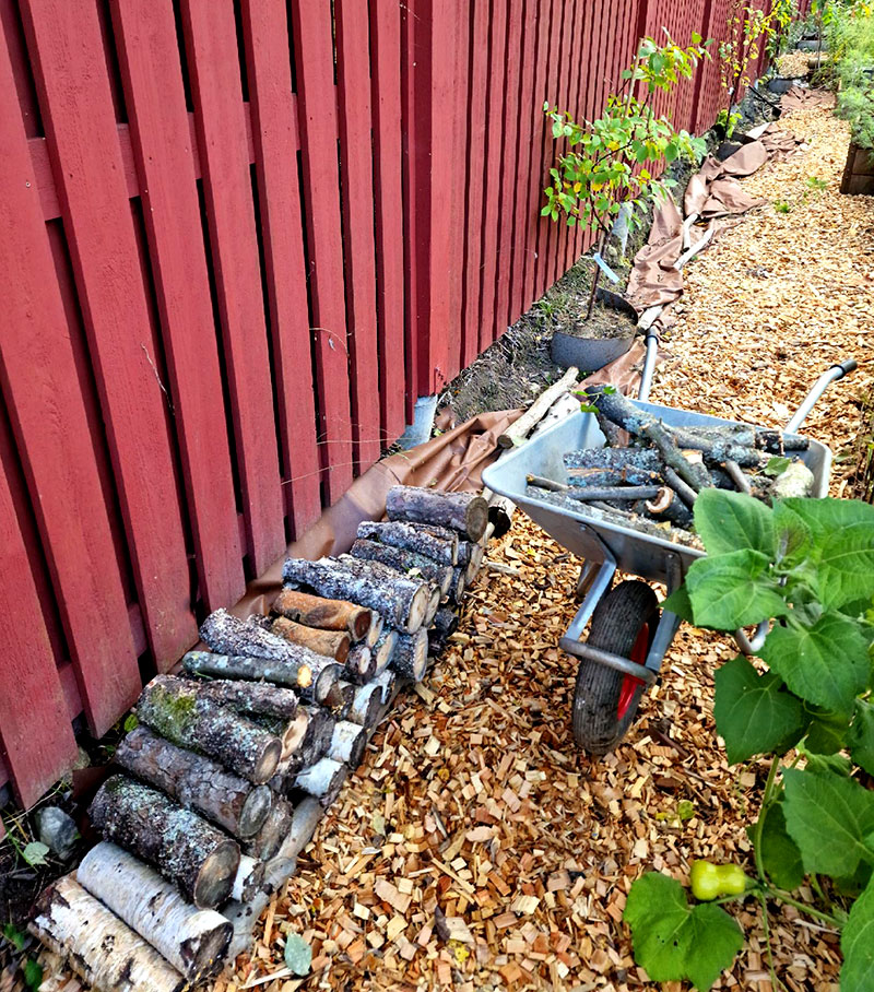 De tunnare grenarna åkte upp på släpet som nu snabbt börjat fyllas igen. De grövre grenarna sågade jag upp och fyllde på insektshotellet med. Jag håller på att bygga ett långt insektshotell längs hela köksträdgården där jag staplar pinnar och grenar längs hela planket så att de små liven får ett bra ställe att bo. Samtidigt hoppas jag de hjälper till att hålla sakadegörare borta från odlingarna.