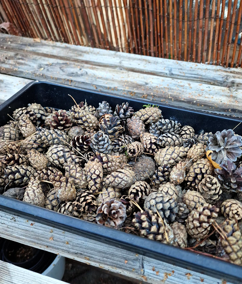 På vägen tillbaka från återvinningssstationen tog mina hundar Spike och Basil och jag en lång, härlig promenad i skogen. Jag tog med en kasse och passade på att plocka tallkottar som nu ligger på tork i växthuset. De ska sedan dränkas i stearin för att bli till smarta tändbriketter för att snabbt få en bra eld i kaminen i vinter.