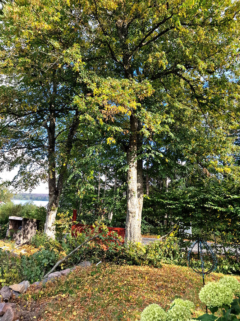 De skuggar och hindrar regnet från att nå ner till häcken jag planterade i våras. Den tog sig inte alls och det är inte förvånande. Jag grävde väldigt djupt och jordförbättrade, men allt för kompakt jord i kombination med den skugga och torka som blev av de stora grenarna ovanför gjorde sannolikheten liten att det skulle lyckas. Så nu, innan jag gör ett nytt försök behövde jag såga ner de nedre grenarna för att släppa igenom mer ljus och regn.