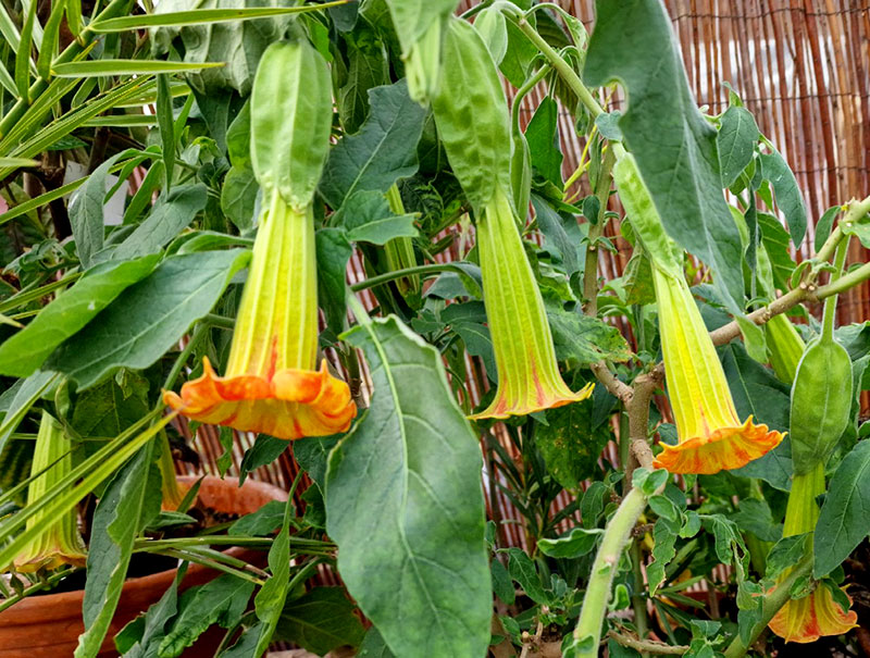 Där blommade det ganska friskt och jag fick en rejäl överraskning när jag såg att änglatrumpeten Brugmansia sanguinea äntligen slagit ut. Den har haft massor med knopp, men inte velat slå ut. Nu stod den rakt framför mig med massor av jättefina blommor.