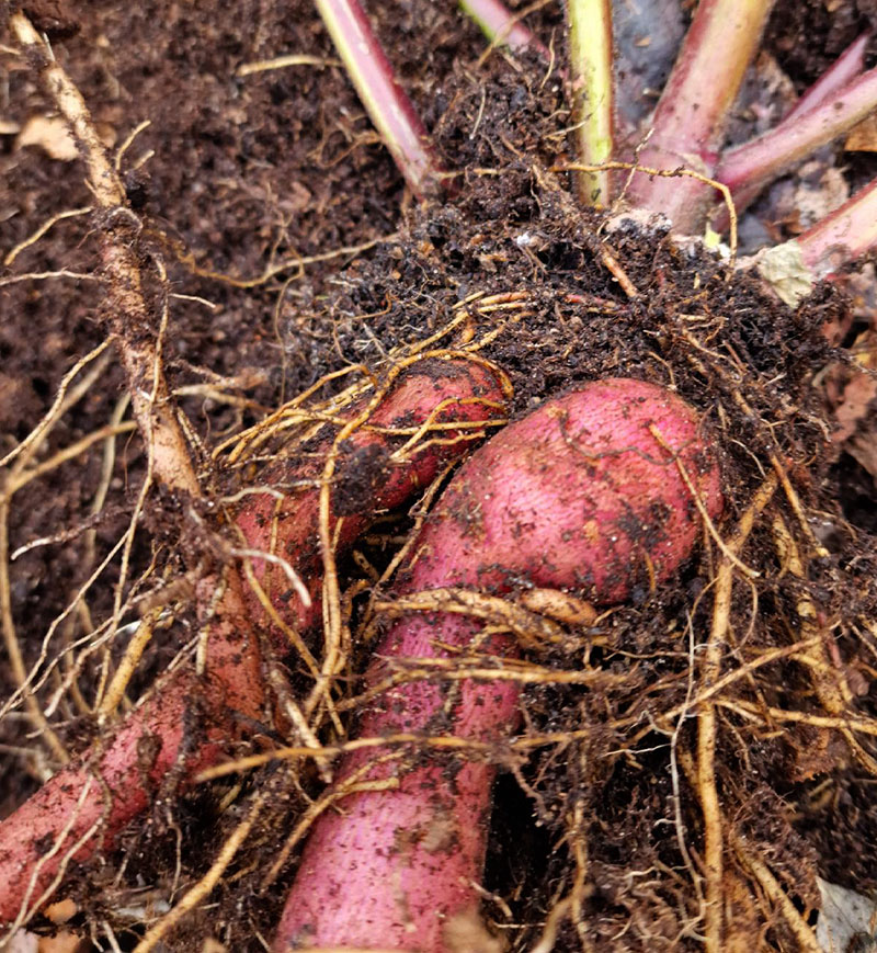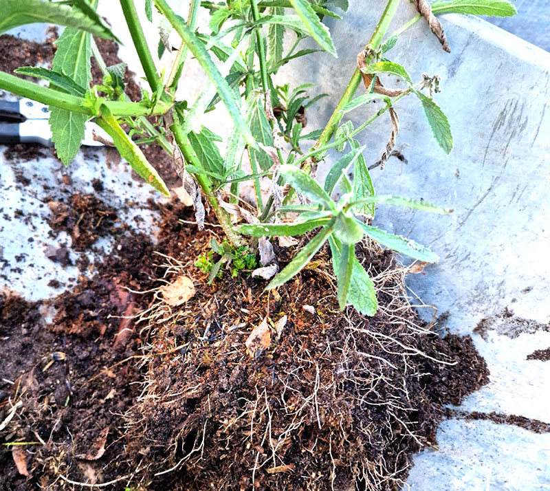 Trots sin storlek har jätteverbenan relativt grunda rötter. På bilden kan man skönja både pigga sugrötter (de vita) och ljusare gröna skott i bladveck och nedtill, ett resultat av den milda hösten där plantan fortsatt att växa.
