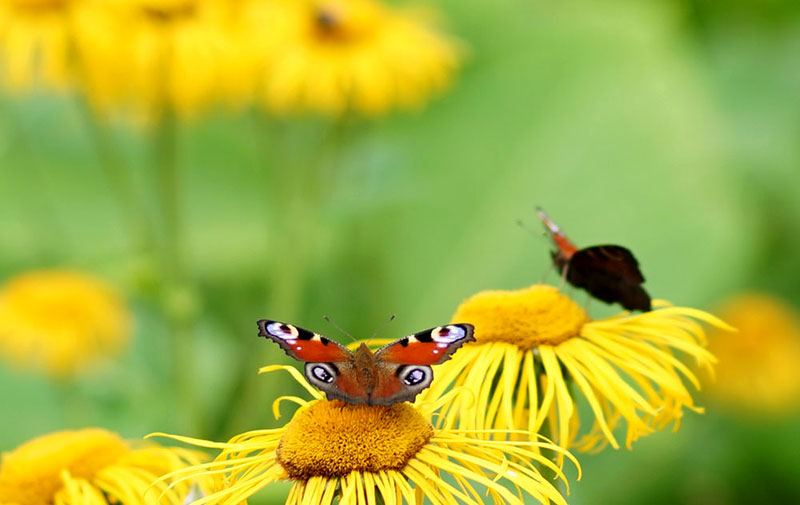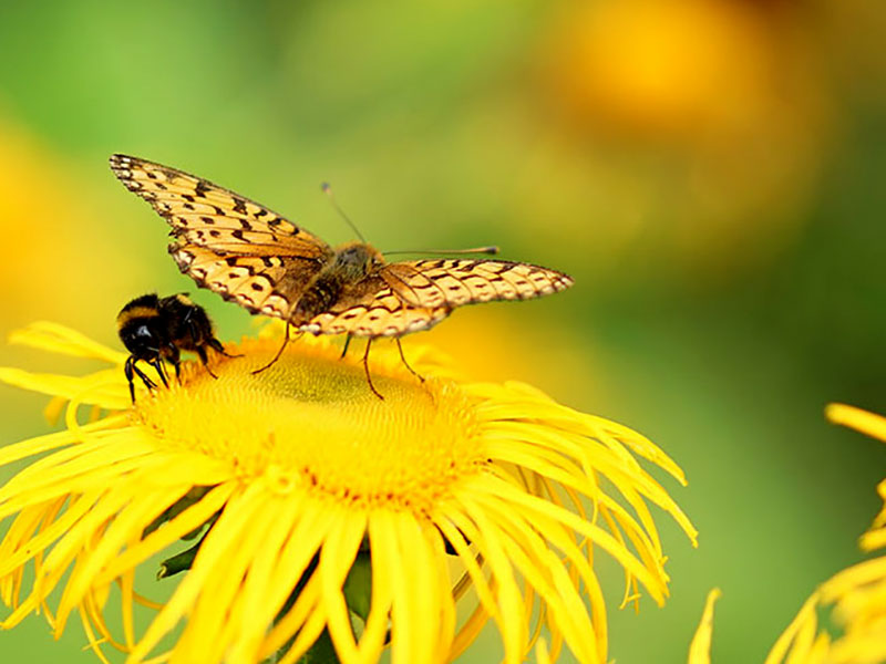 Humla och fjäril på strålöga, Telekia speciosa