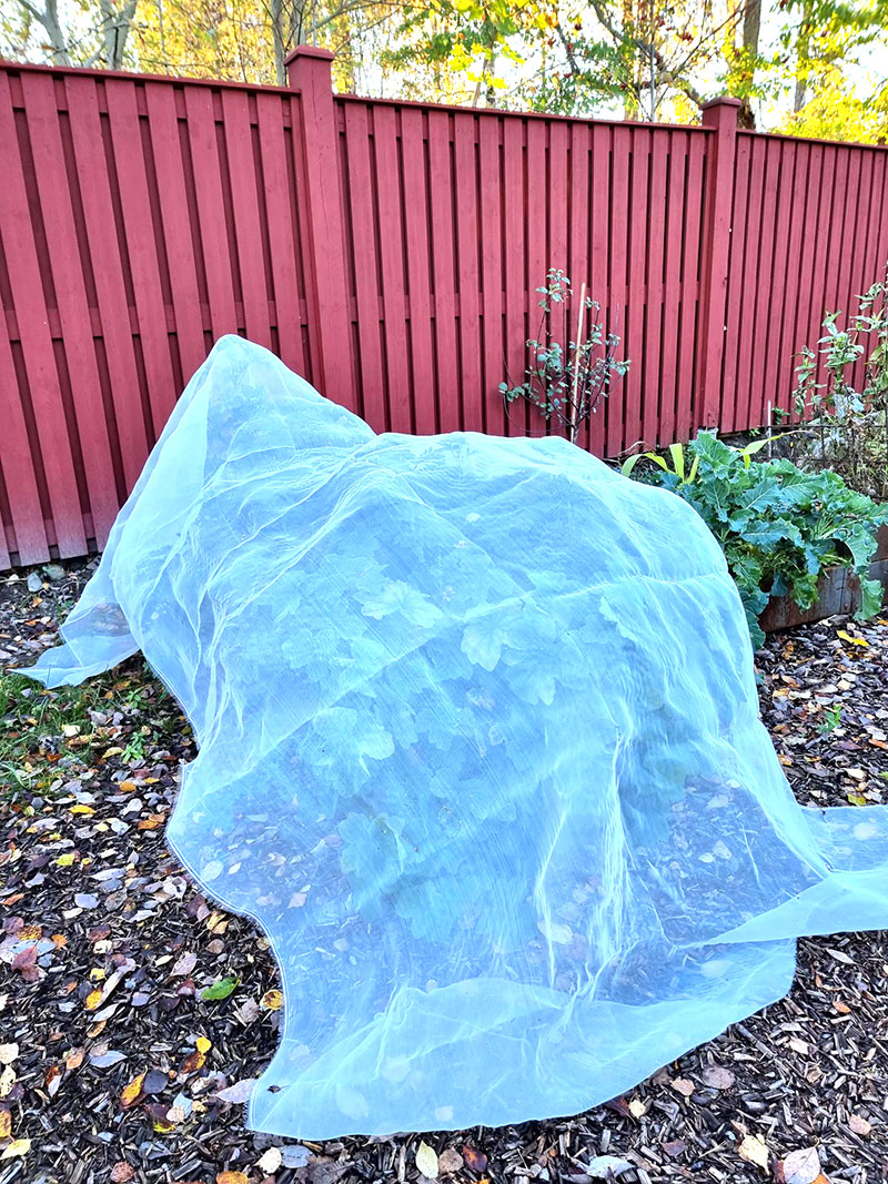 För att fördröja tiden när känsliga växter behöver plockas in kan man som jag har gjort på bilden ovan lägga en skyddande väv över dem på natten eller när en kylig dag väntas. Den skyddar väldigt mycket mer än man kan tro.