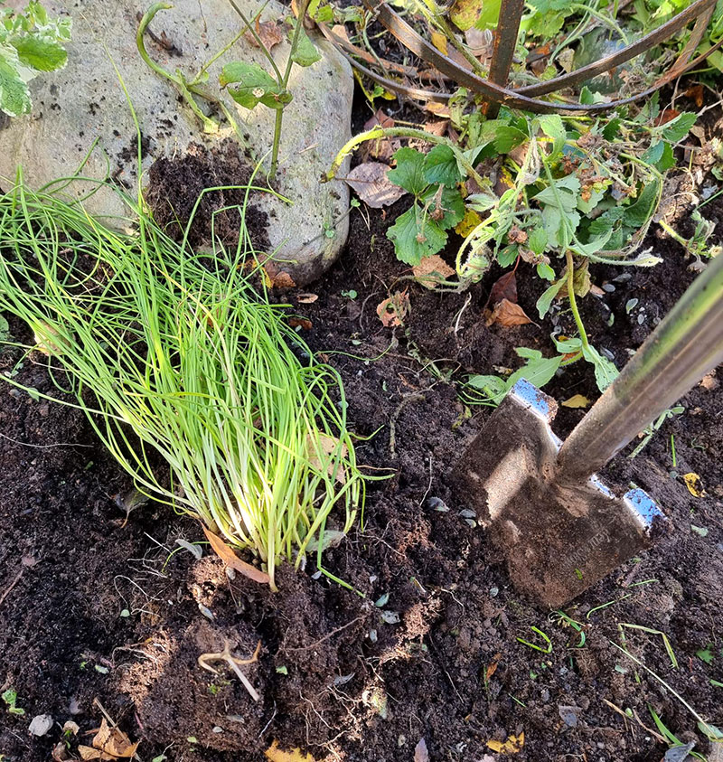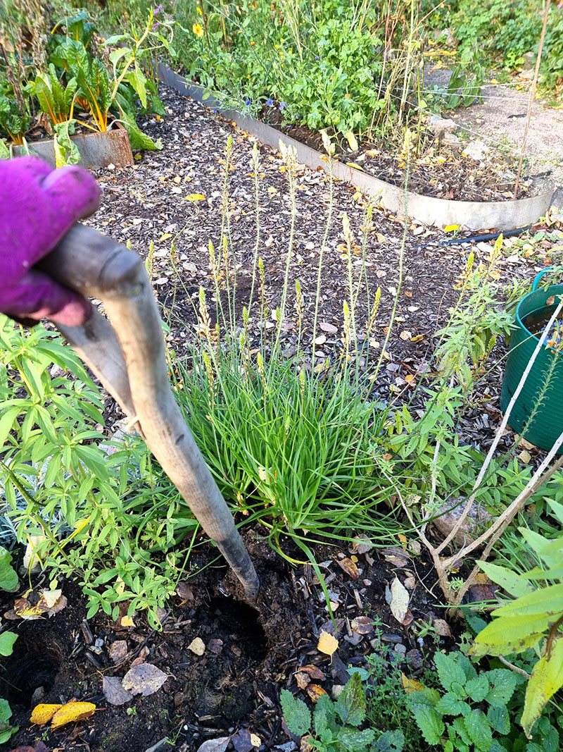 Jag passade också på att gräva upp en rugge gräslök som jag tänker driva vidare i växthuset i vinter. Alltid mysigt kunna klippa färsk. Till våren planterar jag tillbaks den och gräver upp en anna rugge till nästa vinter.