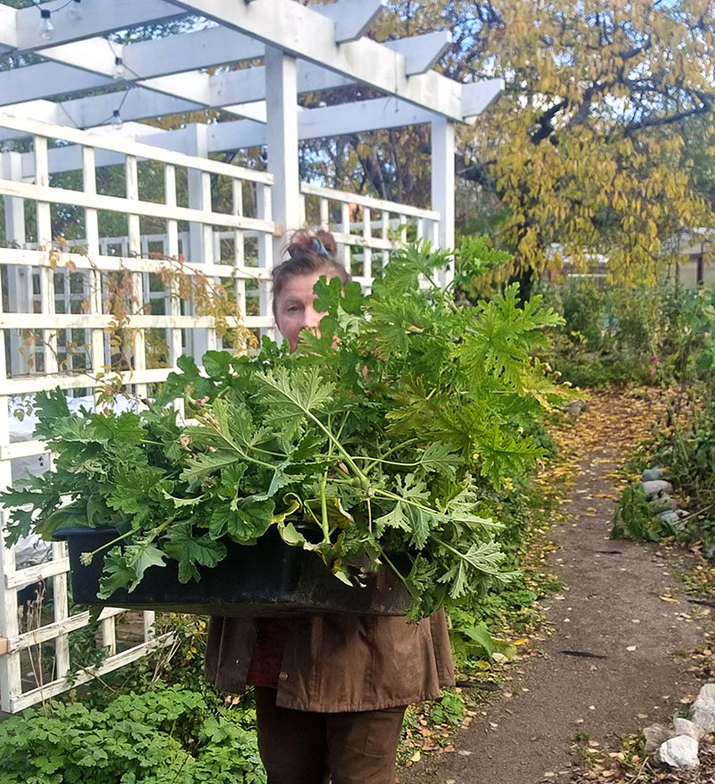 FJag brukar vänta lite förbi den första frosten med att plocka in pelargoner och andra känsliga växter eftersom de tål några minus och till och med kan mår bra av lite kyla innan de får komma in. (Undantaget såklart palettblad och andra växter som blir till slem när kylan kommer och behöver tas in betydligt tidigare)