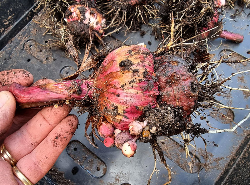 Dahliaknölar och gladiolus grävdes upp. Nu ligger knölar och rhizomer och torkar någon vecka så jag kan skaka av jorden ordentligt innan jag lägger dem i lådor med kutterspån i växthuset. Läs mer om vinterförvaring av lökar och knölar i artikeln Övervintra sommarblommande lök-och knölväxter