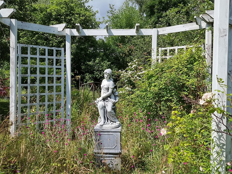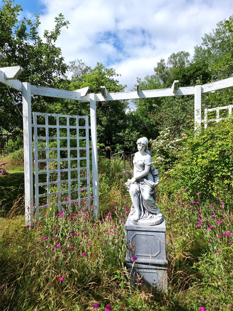 På båda sidor om gången sträcker sig en meterbred rabatt av perenner och självklart tar de då chansen att sätta frö i gången som är mer eller mindre överväxt.