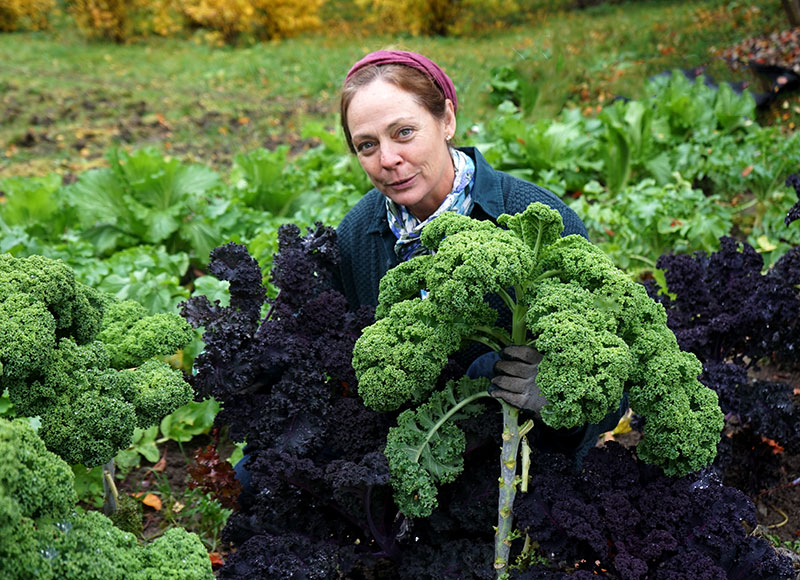 Karin beundrar de vackra grönkålsplantorna i köksträdgården
