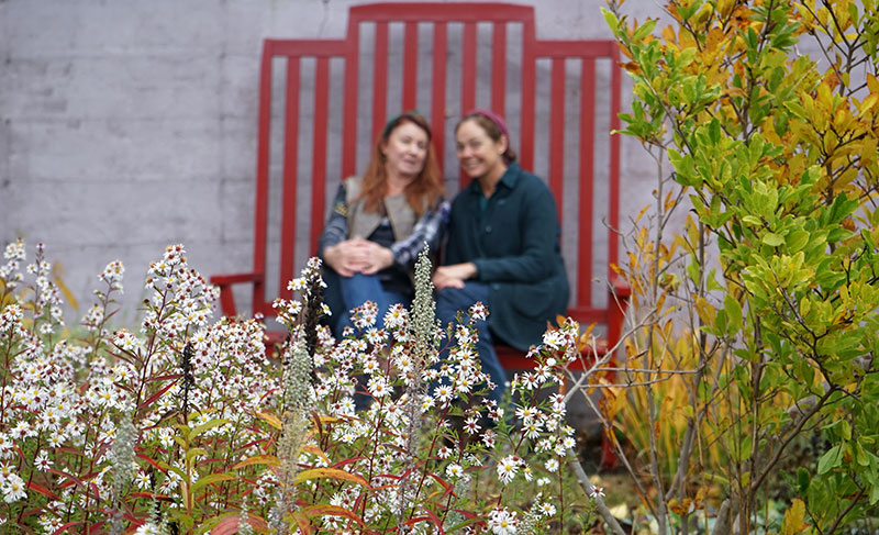 Dags för vila. Här sitter Karin och jag på den fina röda soffan i parken framför de vackra perennrabatterna.