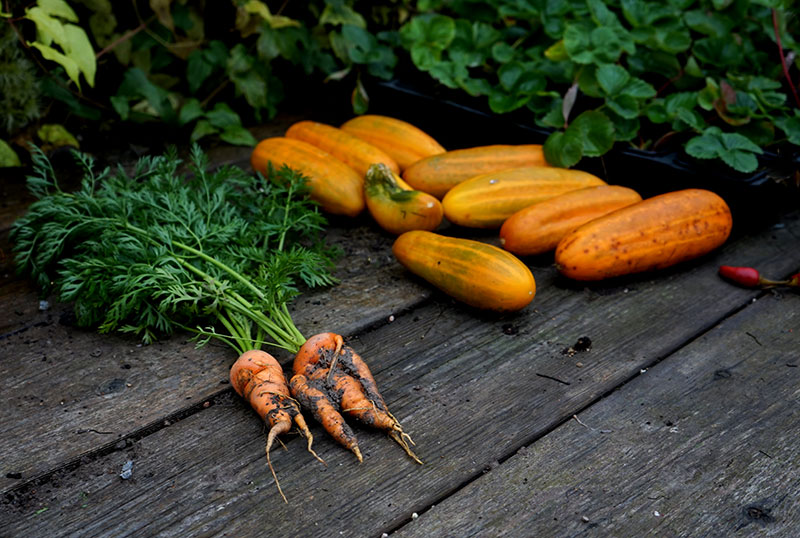 Utanför växthuset låg nyskördade gurkor och ett par väldigt slingringa morötter.