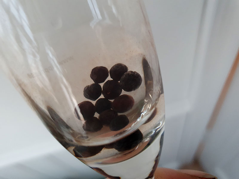 Här ligger några bär med frö från mahonia blötlagda i ett glas.