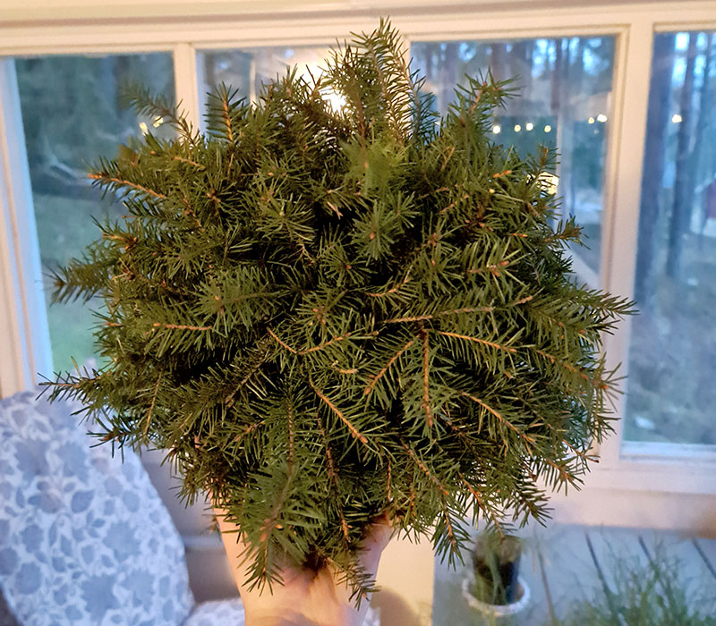 På promenad i skogen såg jag en gran som blåst ner och låg på backen. Vad kan man göra av detta tänkte jag och kom på en idé jag ville testa. Jag ska göra en granboll!