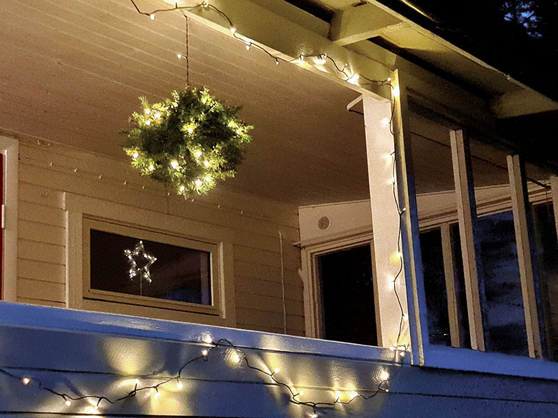 Dekorera granbollen med en ljusslinga och häng upp vid entrén, eller ställ den ovanpå en kruka.