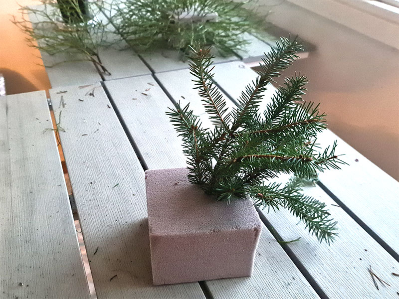 Börja med att skära stickmassan i önskad form. Jag delade bara det rektangulära blocket rakt av i två delar eftersom det ändå kommer döljas av granriset.
