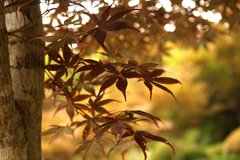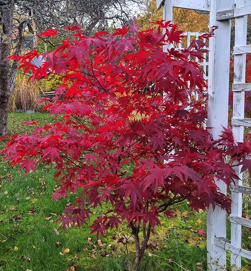 Den mörkt blodröda blodlönnen Acer palmatum 'Atropurpureum' behåller bladen länge och är nästan självlysande ända fram till skymning.