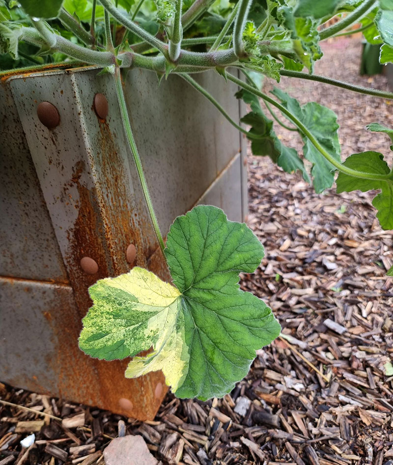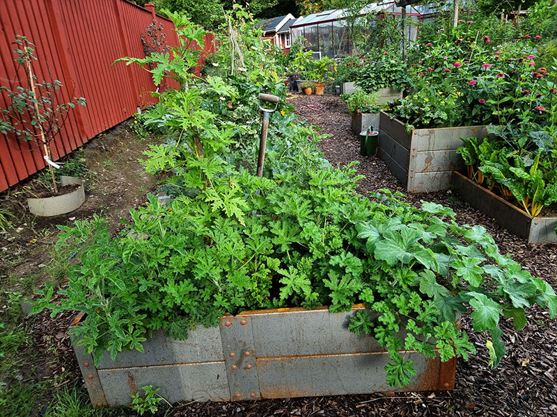 För en dryg månad sedan planterade jag mina doftpelargoner i min nya extra långa odlingslåda i corten.