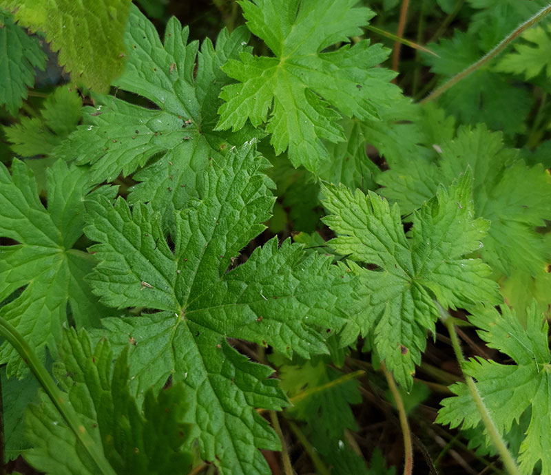 Exempel på hur blad hos spansknäva, Geranium endressii ser ut.