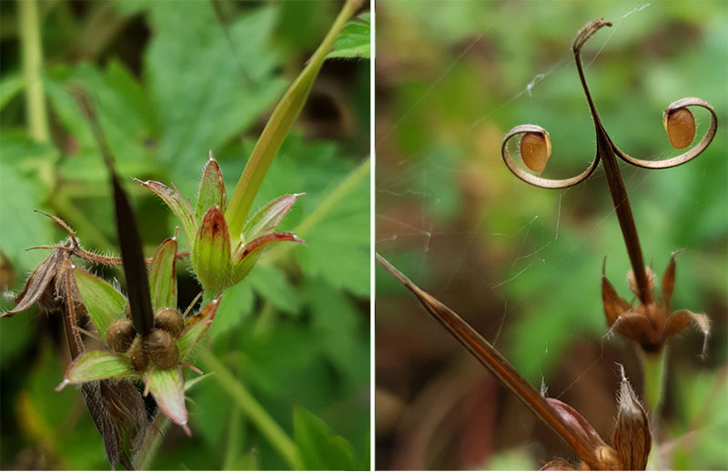 Till vänster ser man hur fröerna sitter tätt tillsammans på väg att mogna. På högersidan ser man hur frökapseln skjutit iväg fröerna.
