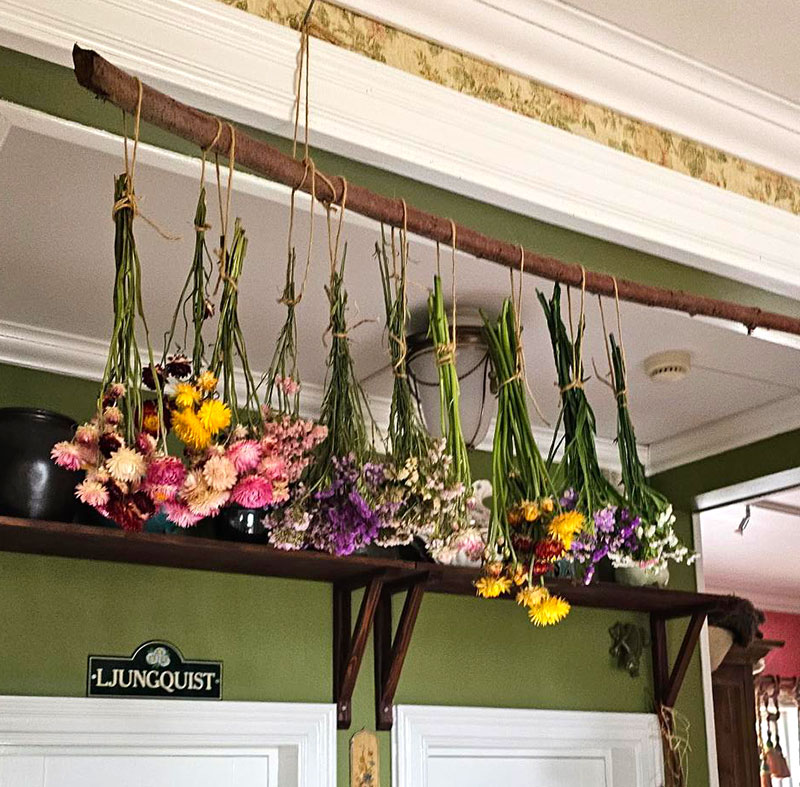 Jag hittade en toppenplats i hallen att hänga upp dem att torka. Hängde upp en kraftig gren och knöt de små buketterna kring den med ett naturfärgat jutesnöre.