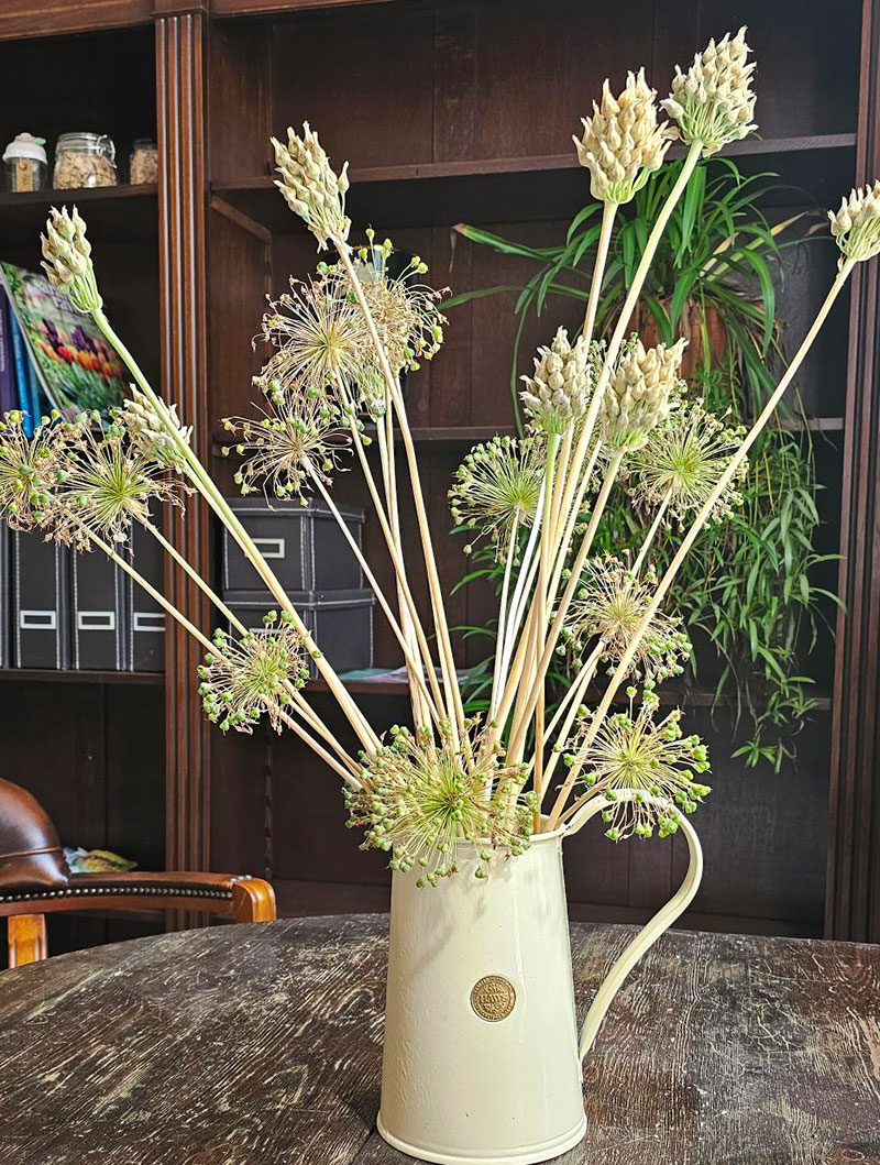 Men självklart går det att torka många fler växter än de som särskilt odlas som eterneller. Här har jag satt överblommade allium och hongungslök på tork i en vas utan vatten. Stjälkarna är så stadiga så de börjer sig inte under torkningen, vilket andra med mer klena stjälkar kan göra.