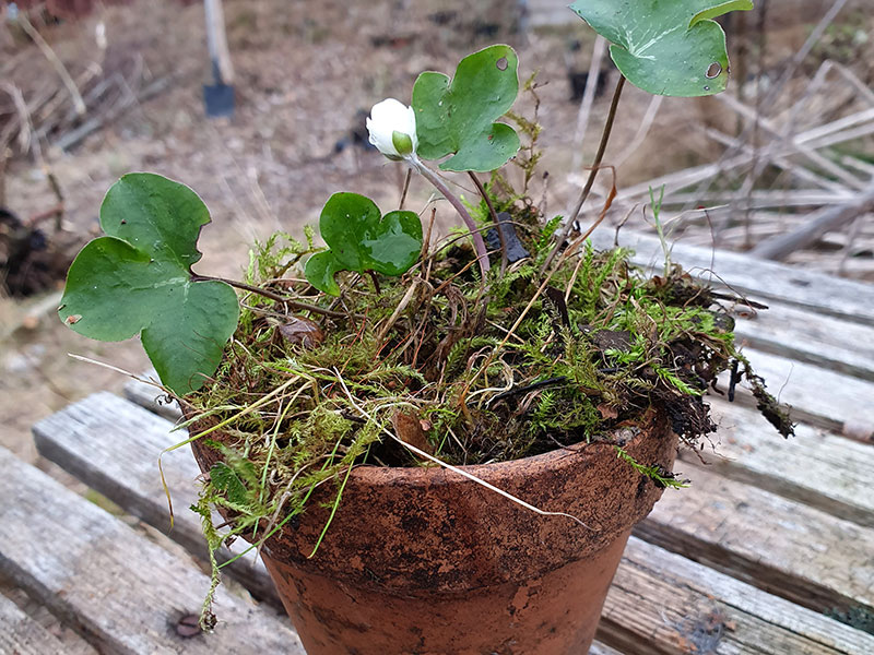 Efter lite letande bland ogräs och mossa hittade jag till min glädje en blåsippa med en vit blomma på väg att slå ut. Förra året såg jag att det kommit upp blåsippsblad där men såg aldrig någon blomning så det blir lite extra spännande att få se hur blomman ser ut när den öppnar upp ordentligt.
