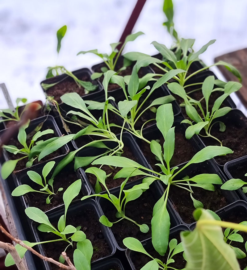 Frösådda småplantor av vit pipört övervintrar i växthuset.
