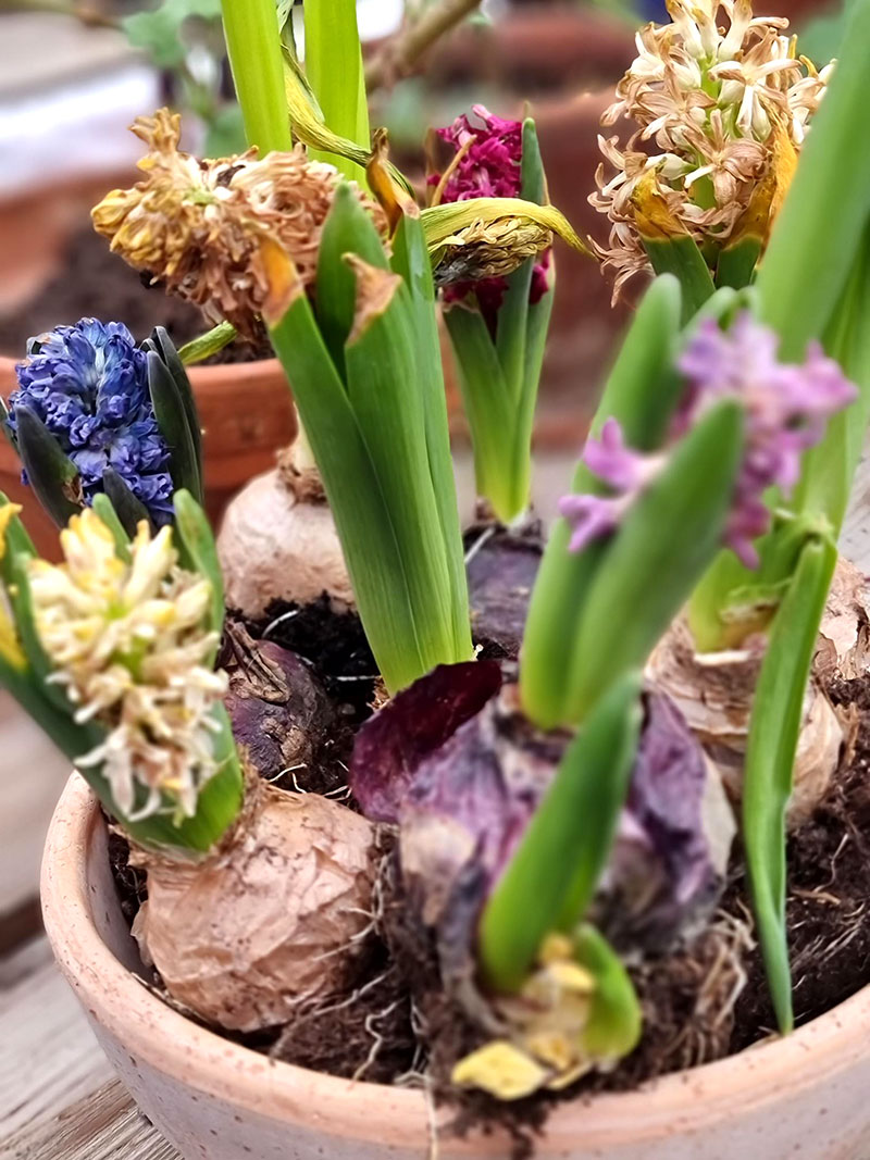 Jag tog med mig överblommade hyacinter upp till växthuset där de nu ska få stå och bara vara med minimal vattning fram till i vår. Då planterar jag ut dem i en rabatt där de kommer blomma igen och igen många år framöver. Så har jag gjort under flera år och här blommar fler och fler hyacinter varje år på vårkanten.