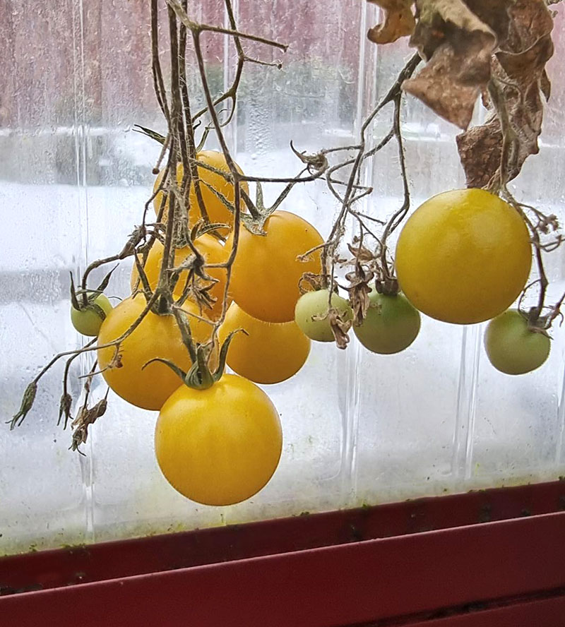 Idag har jag skördat årets första tomater. De kommer inte från årets plantor utan från en planta med många knappt mogna frukter som fick stå kvar i växthuset i höstas.