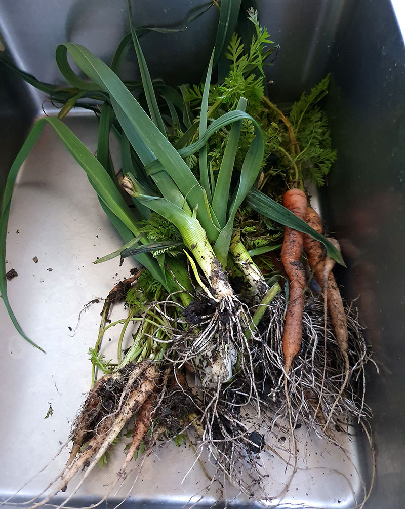 Utsikten från vinterträdgården ut över fält, skog och åkrar var väldigt vacker. Närmast huset kunde man också se den nyanlagda köksträdgården med odlingstunnlar över känsliga grödor. Tidigare på dagen hade det skördats morötter och purjo. De såg fantastiskt fina ut.