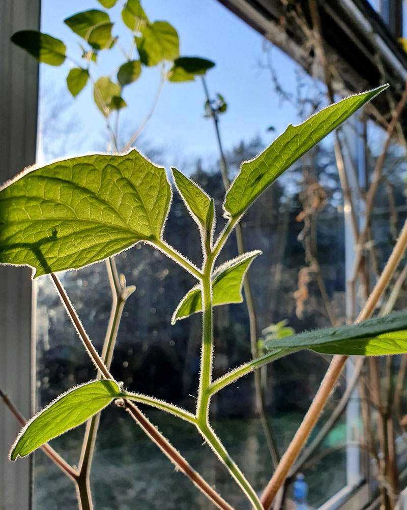 En nära släkting till tamarillon, kapkrusbär har övervintrats från förra året. Den hade redan många fina gröna blad och små blomknoppar på väg.
