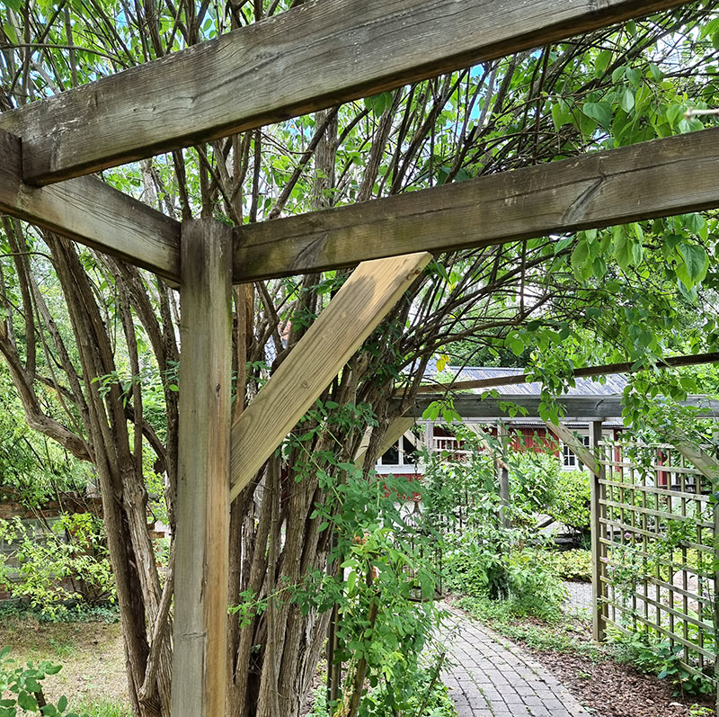 Jag har en pergola som går mellan bostadshuset och gäststugan som med åren blivit lite skev. Härom veckan fick jag hjälp att staga upp den med lite tvärreglar, men det såg hemskt ut med detta nya trä mot det gamla så jag var direkt på och penslade med järnvitriolen.