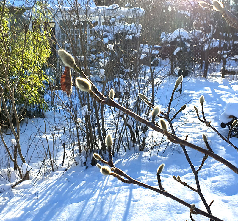 Mina magnolior är fulla med "magnoliakissar" som förhoppningsvis klarar kylan och slår ut om någar månader. Visste du att dessa ludna knoppar skyddar den verkliga blomknoppen som ligger inuti sitt lilla pälsskydd för att skydda mot kylan. Fiffigt va!