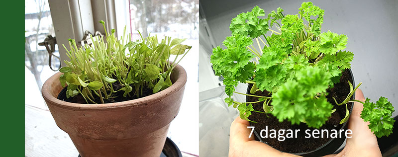 I odlingsrummet står persiljan som jag planterade den 7 februari under en av mina växtlampor och det var ganska imponerande tillväxt på bara en vecka. Kolla in artikeln Skörda mer persilja.