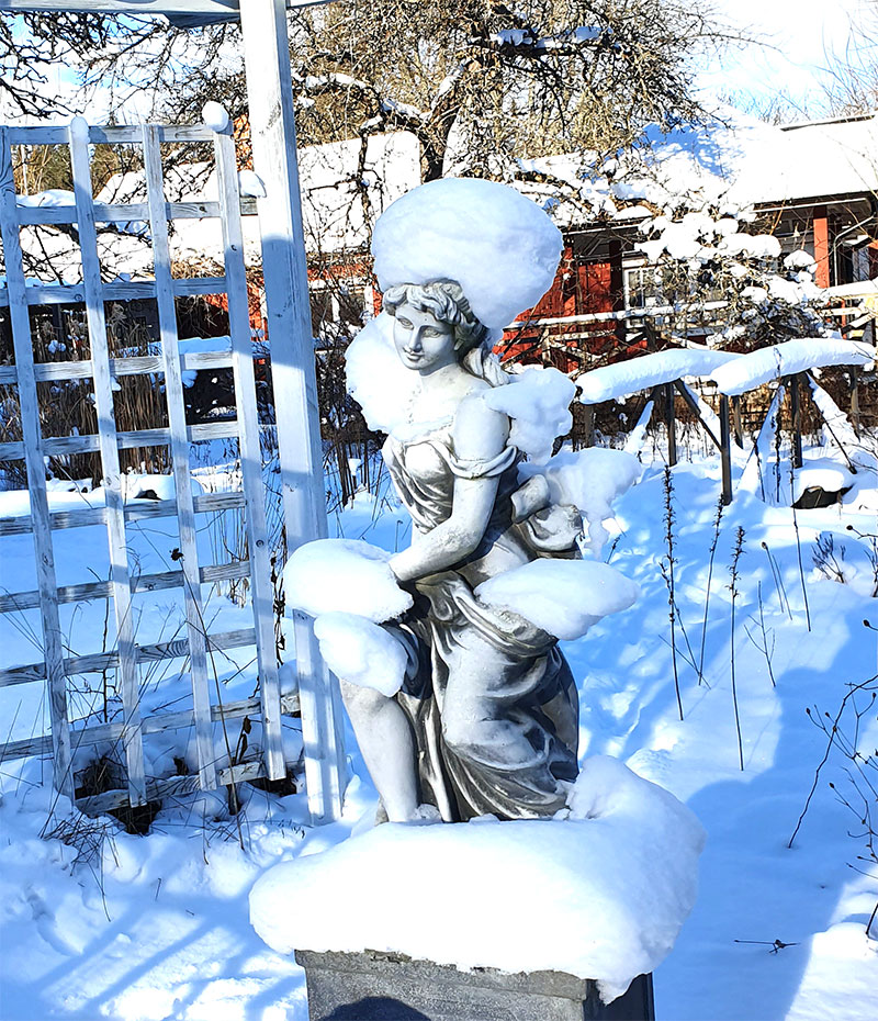Min "trädgårdstant" hade fått en badmössa. Jag gillar henne skarpt, lite kitschig, men samtidigt med lite stil. Hon står perfekt placerad i en liten rotunda längs gången till gästhuset.