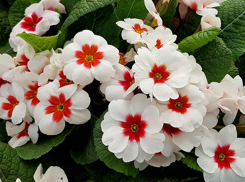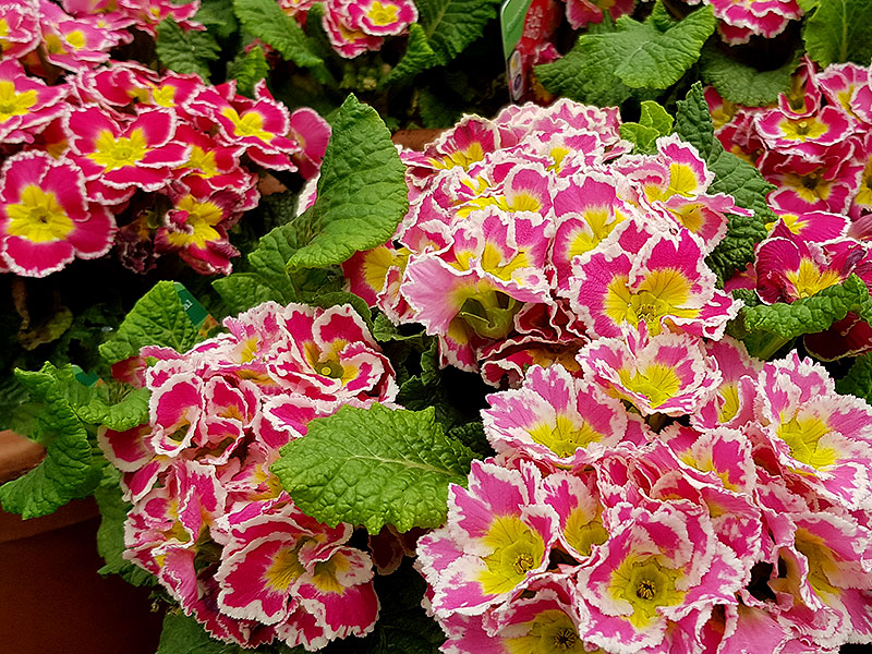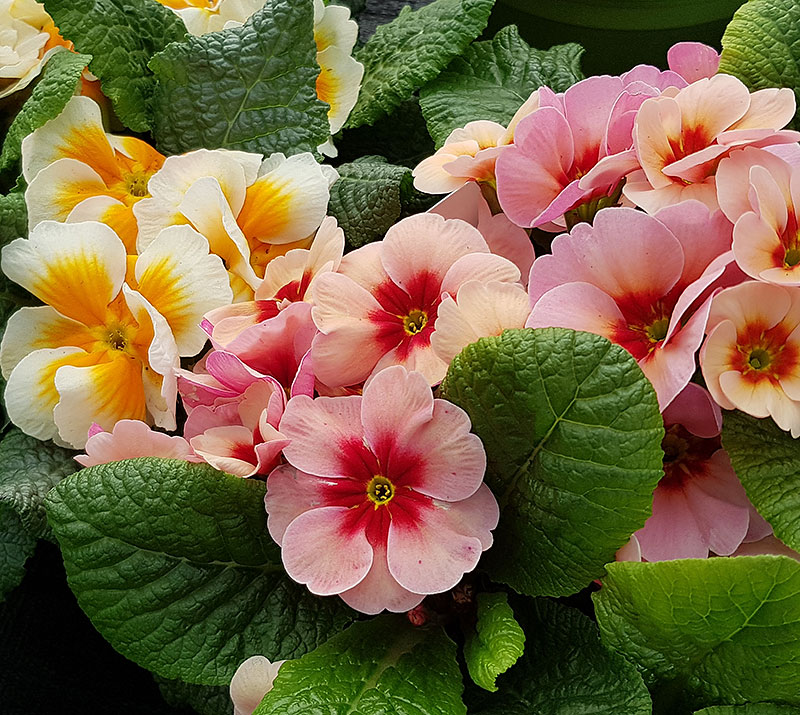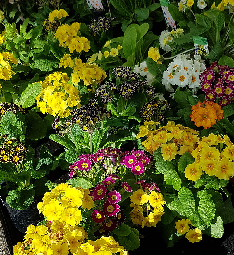 Ett riktigt smörgåsbord med olika sorters primulor.