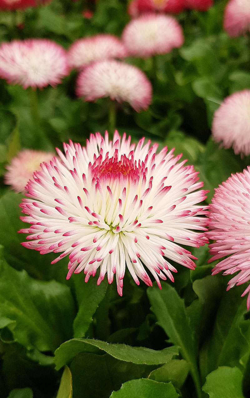 Jag bara måste visa upp denna lilla skönhet som stod i närheten av primulorna. En bellis, tusensköna med riktigt fin form och färg. Jättefin i krukplantering. Denna dubbla form har dock svårt att klara sig någon längre tid i rabatten hemma hos oss i Sverige.