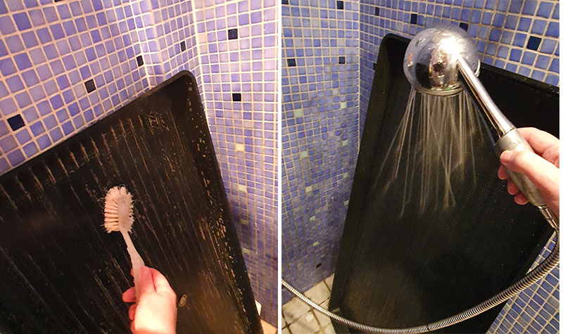 Större saker som odlingsbrickor och planteringsbord åker in i duschen och får en redig skrubb med vatten och såpa i ett par omgångar.