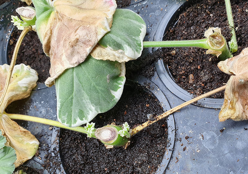 Hos några av dem hade bladen vissnat helt och hållet. Då är det lätt att tro att det är kört, men det behöver det inte alls vara. Det här gäller inte bara när man tar sticklingar av pelargoner utan också många andra växter så ge inte upp för att bladen vissnar. Vänta ut vad som händer några veckor och först om själva stjälken vissnar är det dags att ge upp.