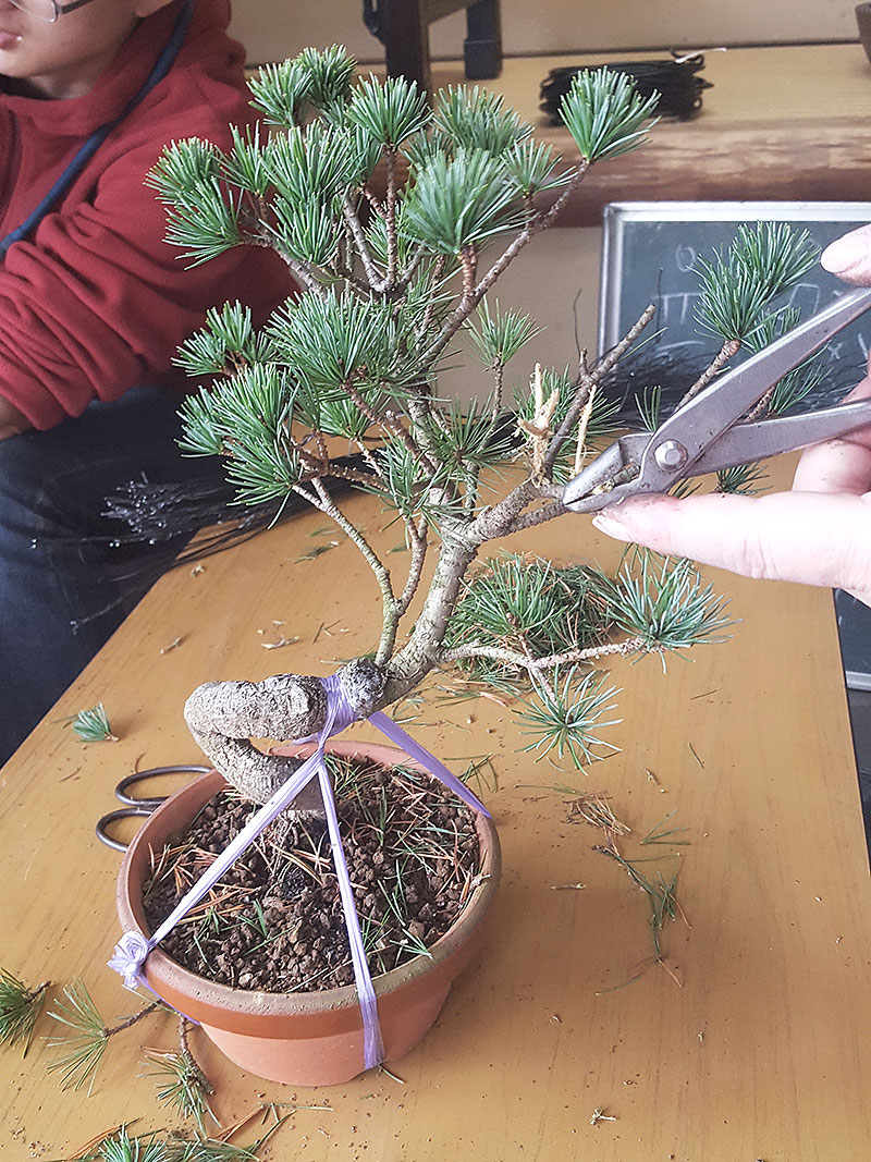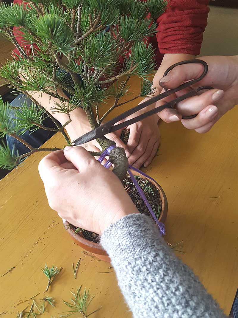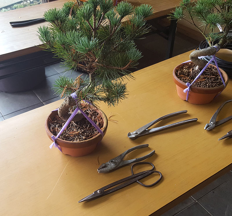 Materialet vi fick att utgå ifrån var små tallar. Det var egentligen en lite kraftigare stam som grenar ympat på men det var inga helt unga träd precis. Jin berättade att de var 10 år gamla!