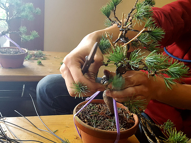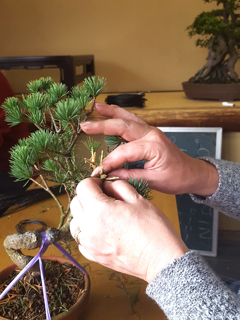 Jin tyckte att ett av toppskotten på min bonsai kunde göras till en torkad topp vilket kan ge den ett mer realistiskt och intressant utseende. Han knipsade flinkt av barrtopparna och använde sedan en platt tång som han försiktigt klämde runt gren efter gren först åt ett håll och sedan bytte han vinkel och upprepade över hela området. Det gjorde att barken lossnade och därefter var det bara att försiktigt dra och pilla loss den. Just nu är den ju färskt trävit men med tiden grånar det och blir säkert jättesnyggt.