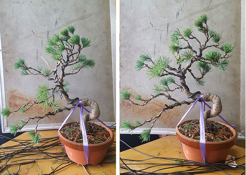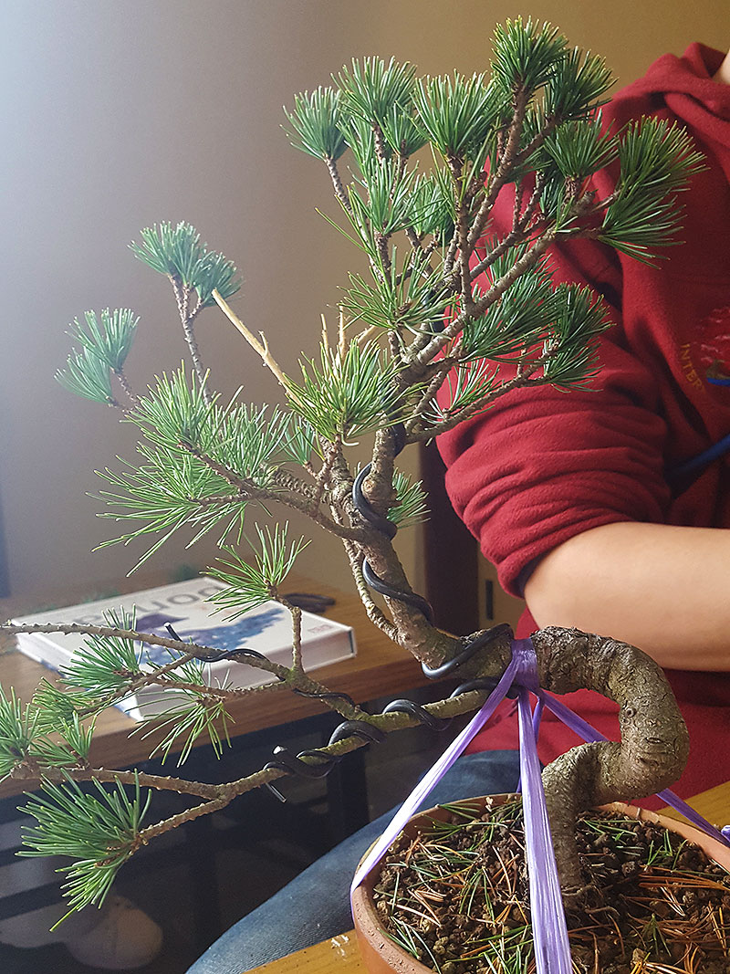 Vi fick veta att tråden skulle sitta i ca 2 år innan vi lindar om den. Hur länge den ska sitta är olika på olika växtslag och hur gammal bonsaien är.