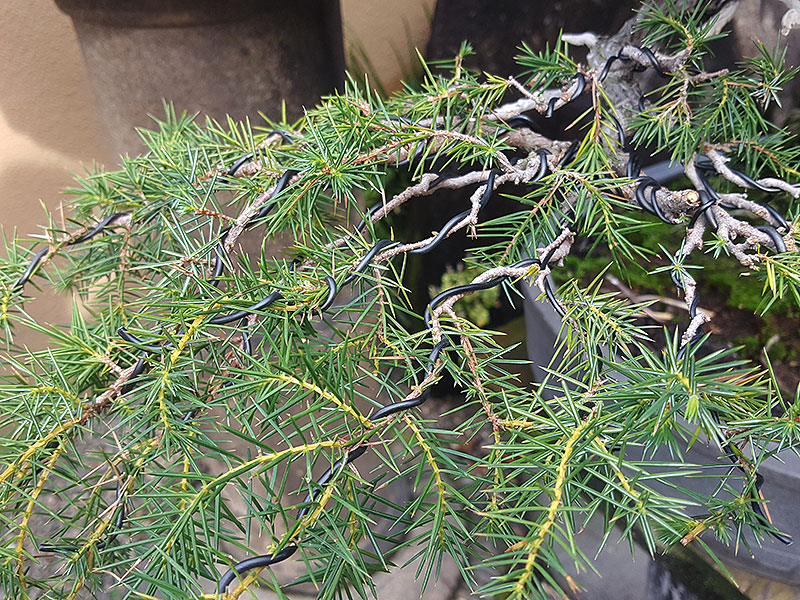 Det gör man genom att linda hela plantan med olika kraftiga ståltråd. Jag trodde man bara skulle binda den där man ville justera lite, men varenda gren skulle vajras.