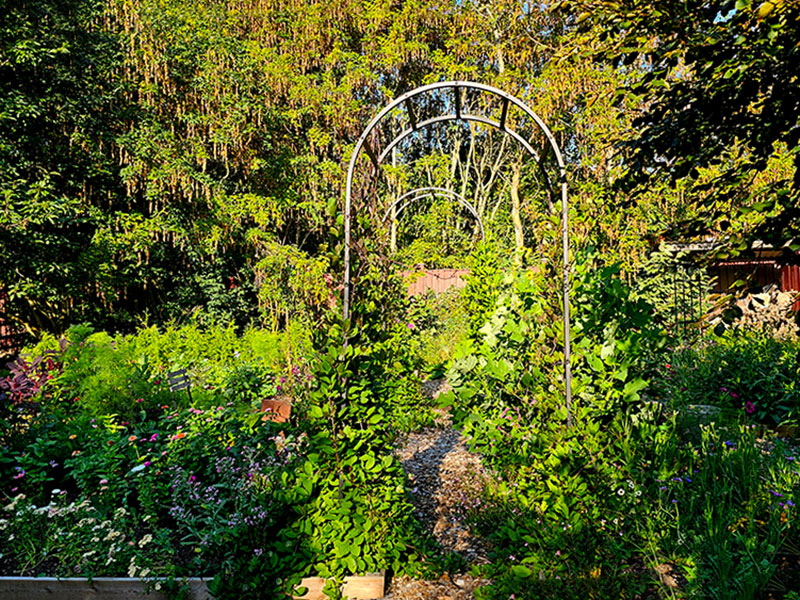 I mitten på bilden, dolt av allt det gröna finns en lite sittplats perfekt för lite meditation och insupande av väldofter och det härliga ljudet av surrande humlor och fåglarnas glada kvitter när de stjäl den frukt på träden som jag inte når.