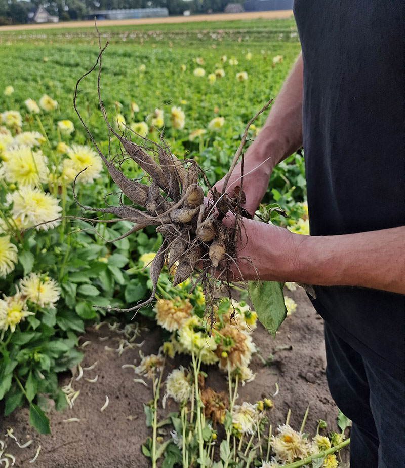 Här visar Sam ett exempel på hur en dahliaknöl kan se ut när den grävs upp. På det här fältet tilläts några rader att blomma för att kontrollera sortäktheten. En del i kvalitetskontrollen så att vi hobbyodlare ska veta att det är rätt sort.