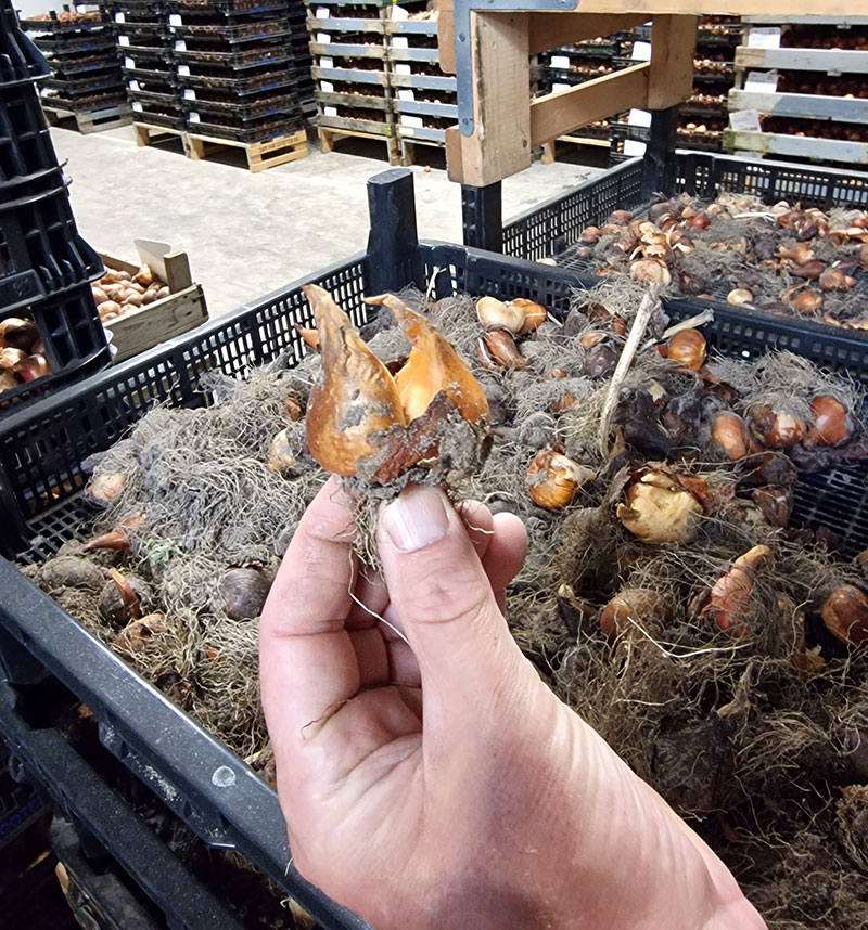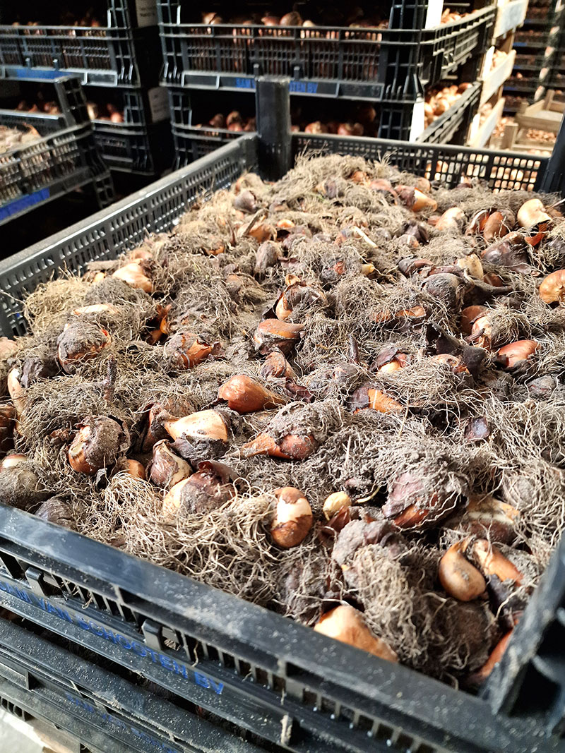 Sam visade också upp några lådor med nyss skördade tulpanlökar han berättade är en helt ny sort. Det tar några år att utveckla nya sorter. Olika sorters tulpaner korsas. Fröerna sås och löken ska växa till och bli tillräckligt stor för att blomma. Sedan görs urvalet och eftersom varje enskilt frö kan ge olika resultat kan det vara så att det är en lök som sedan behöver förökas upp till många, många för att om ett antal år komma ut på marknaden.